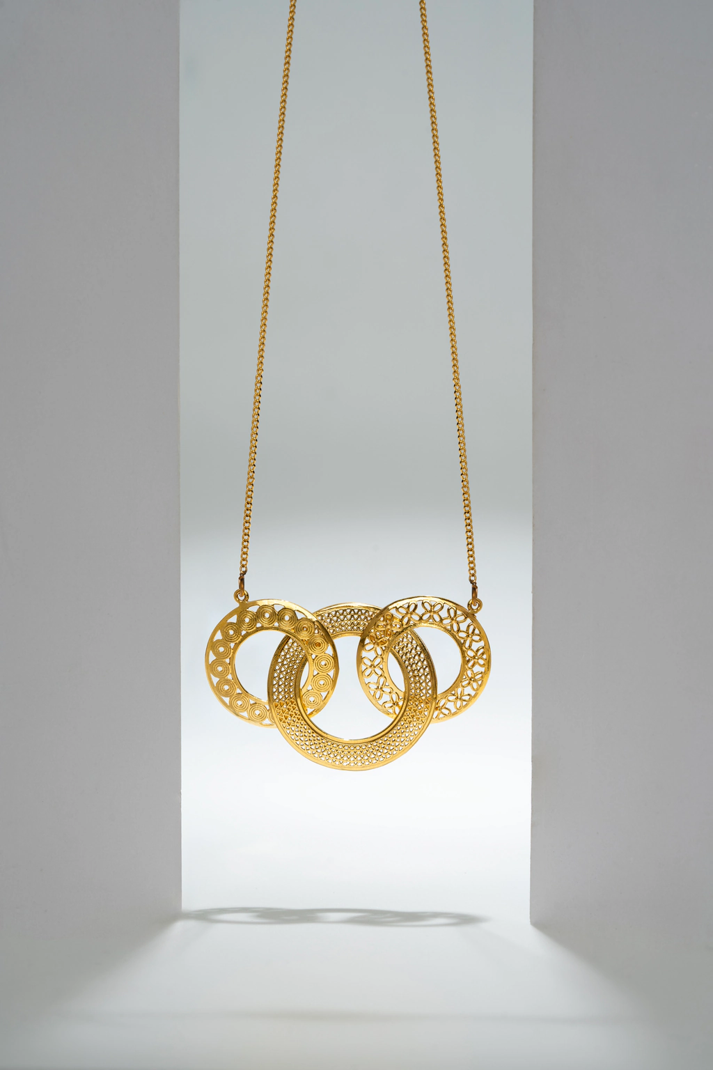 This 22k gold pendant showcases a modern and elegant design, featuring three interlocking circles crafted with intricate detailing gives this beautiful piece a timeless and contemporary appeal. This Pendant is a versatile accessory suitable for both casual and formal occasions.