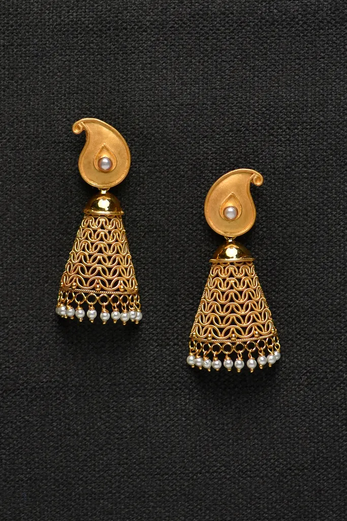 These stunning earrings with drop motifs will enhance your style everytime you flaunt them on your earlobes.Made from 22k gold, this pair of earrings are showcasing a traditional Indian design. The earrings feature a distinctive paisley or "kalka" motif at the top, crafted from the rich, warm-toned 22k gold, indicative of its purity. Below the paisley element, a conical or bell-shaped structure dangles, crafted with intricate filigree work, creating a delicate, net-like pattern enhancing the sparkle and brilliance of the gold. Tiny beads along the bottom adds a touch of detail. The earrings exude a sense of elegance and sophistication, suggesting this piece when worn for both traditional and festive occasions will be reflecting the timeless appeal of gold jewelry.