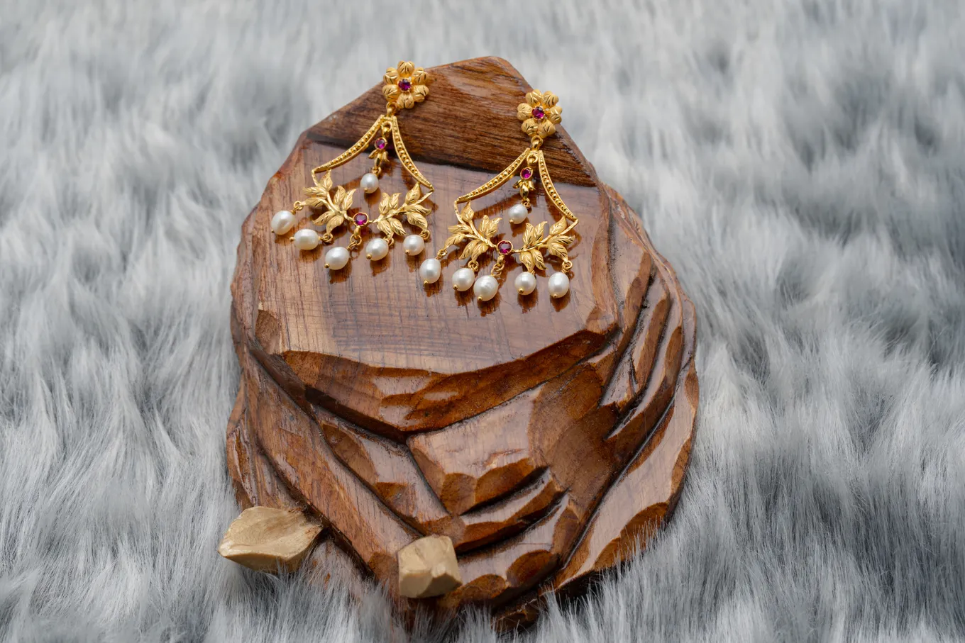 If you ever in love with chandbali then this pair of earrings is perfect for you. These gold chandbali earrings enhanced with elegant cultured pearls that give you a personified look. These exquisite gold earrings showcase a delicate and intricate design, blending floral and nature-inspired elements with timeless elegance. The top stud features a beautiful gold flower with a red gemstone at its center, adding a hint of vibrancy. Delicate gold chains extend downward, forming a graceful arch adorned with finely detailed gold leaves and additional red gemstones. Suspended from these golden branches are lustrous pearl-like drops, enhancing the earrings' regal and sophisticated appeal. Adorn this with any traditional wear to get a beautiful look.