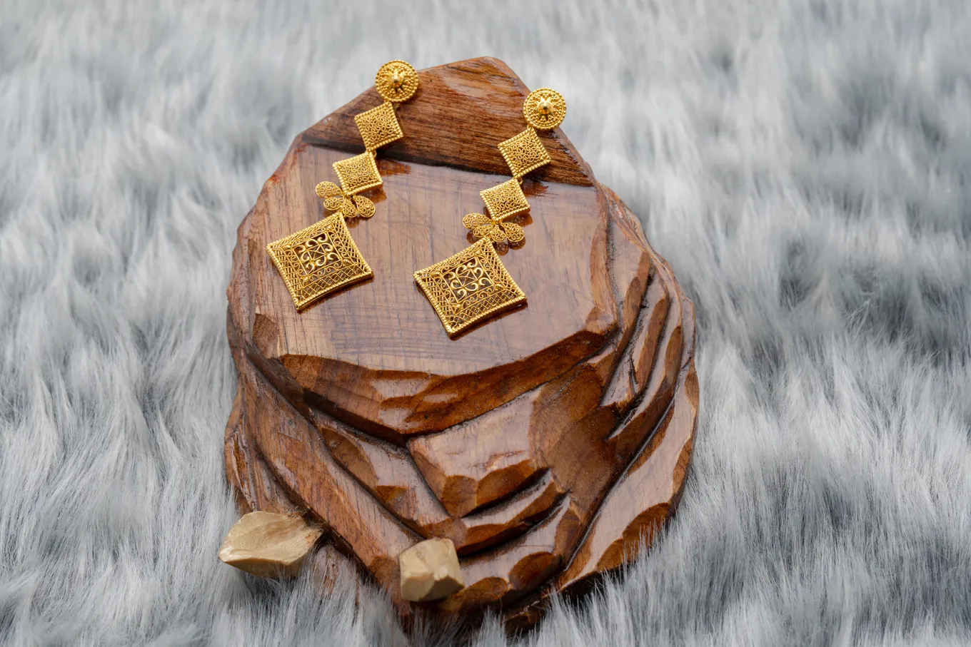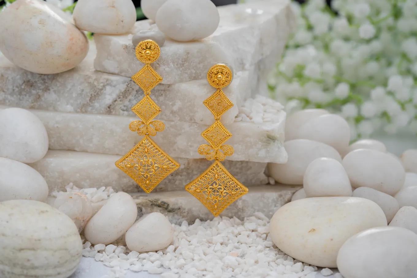 This stylish pair of gold earrings features a contemporary design featuring gold geometric patterns interlocked with each other. These stunning 22k gold earrings exude elegance and sophistication with their intricate geometric designs each of which are adorned with fine detailing and ornate craftsmanship. The openwork lattice design within the larger diamond adds a touch of lightness and intricacy, making the earrings both bold and graceful. These gorgeous dangling earrings are perfect for special occasions, adding a regal charm to all traditional apparel.