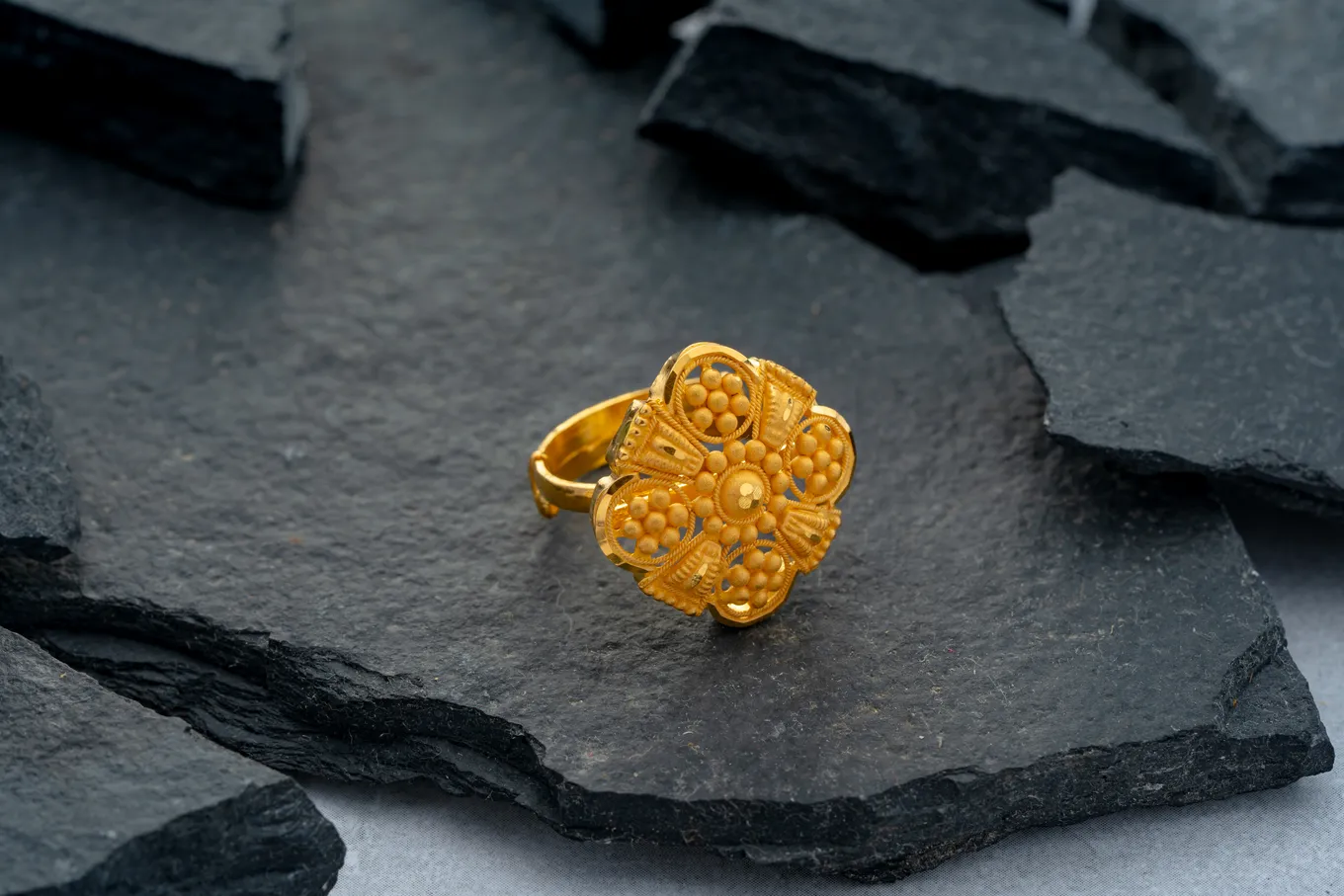 This 22k gold traditional ring features a floral design with intricate detailing. The petal of the flower creates an ornated look, flaunting warmth and richness of the design. Wear it and make yourself feel special because you are.