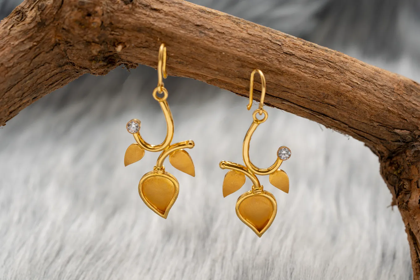 Pair this beautiful 22K gold earrings with your traditional outfit and embrace elegance. The intricate design symbolizes new beginnings, growth and warmth of change. The subtle sparkle of gemstones hints a t dewdrops which symbolizes freshness. So own them and celebrate yourself everyday.