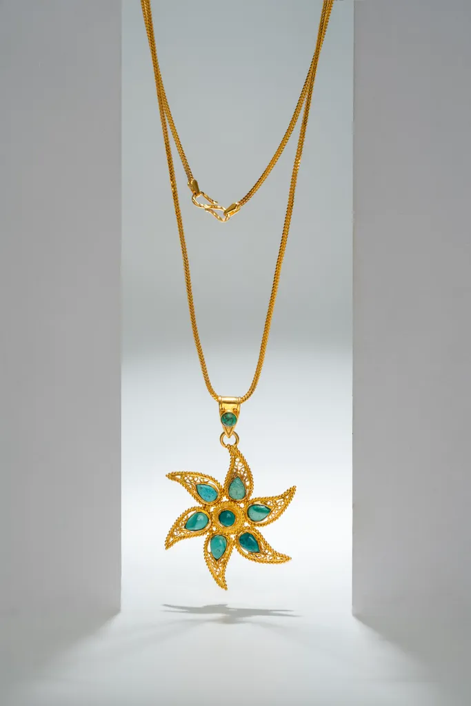 This 22k gold pendant embodies celestial elegance with its radiant star shape, blending simplicity with sophistication. The five-pointed star, crafted from high-karat gold, symbolizes hope and guidance.The clean lines and smooth curves give the piece a timeless charm. Whether worn alone or layered with other pieces, this pendant adds a touch of brilliance to any outfit, inspiring confidence and aspiration in its wearer.