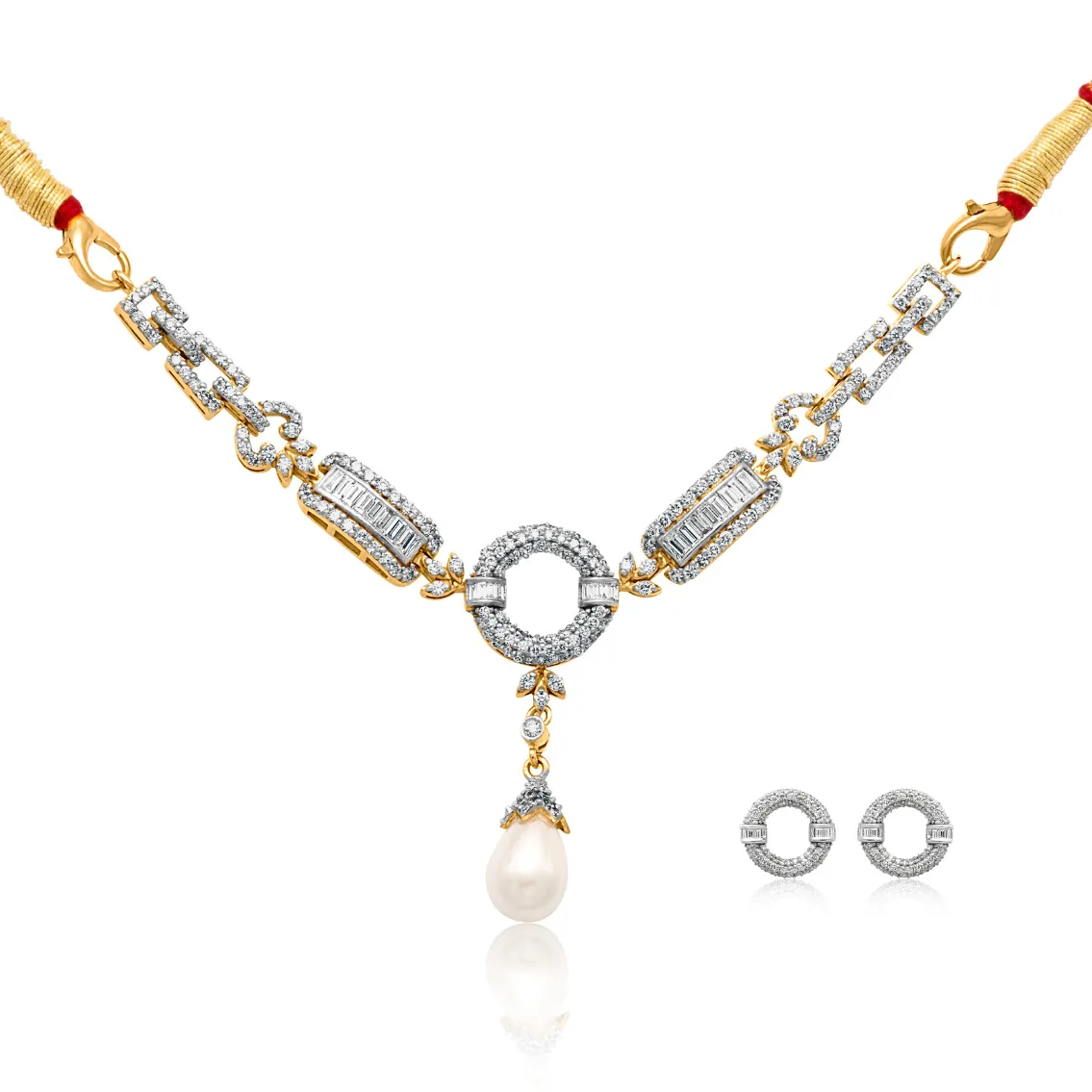 Elevate your elegance with this exquisite diamond necklace set, featuring a stunning blend of modern design and timeless beauty. Crafted in a luxurious gold finish, the necklace showcases an intricate arrangement of shimmering diamonds in both baguette and round cuts, forming a sophisticated pattern that radiates opulence. The centerpiece is a dazzling circular motif adorned with brilliant diamonds, gracefully finished with a single, lustrous pearl drop for a touch of classic charm. Paired with matching circular diamond earrings, this set is perfect for weddings, festive occasions, or upscale evening events. Designed to captivate, this necklace set is a true testament to refined craftsmanship and style.