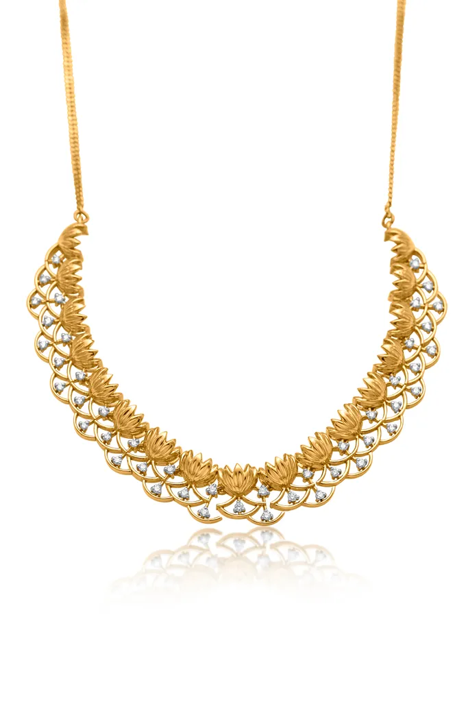 Elevate your elegance with this exquisite diamond necklace set, featuring a stunning blend of modern design and timeless beauty. Crafted in a luxurious gold finish, the necklace showcases an intricate arrangement of shimmering diamonds in both baguette and round cuts, forming a sophisticated pattern that radiates opulence. The centerpiece is a dazzling circular motif adorned with brilliant diamonds, gracefully finished with a single, lustrous pearl drop for a touch of classic charm. Paired with matching circular diamond earrings, this set is perfect for weddings, festive occasions, or upscale evening events. Designed to captivate, this necklace set is a true testament to refined craftsmanship and style.
