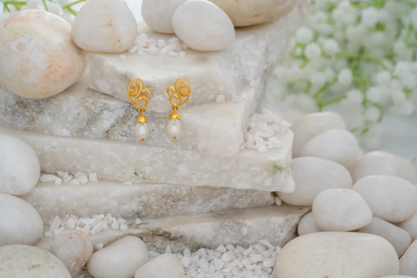 These chic yet simple 22K gold drop earrings are perfect for your office look, featuring elegant paisley and inverted paisley patterns connected by a hook. These exquisite 22k gold earrings embody elegance and sophistication with their delicate design. The intricate gold framework features graceful curves, creating an airy, artistic look that adds a touch of femininity. Suspended from the gold structure is a lustrous pearl drop, beautifully capped with a gold petal-like element, enhancing the overall aesthetic. Their lightweight and refined craftsmanship make them an ideal choice for those who appreciate subtle yet luxurious jewelry.