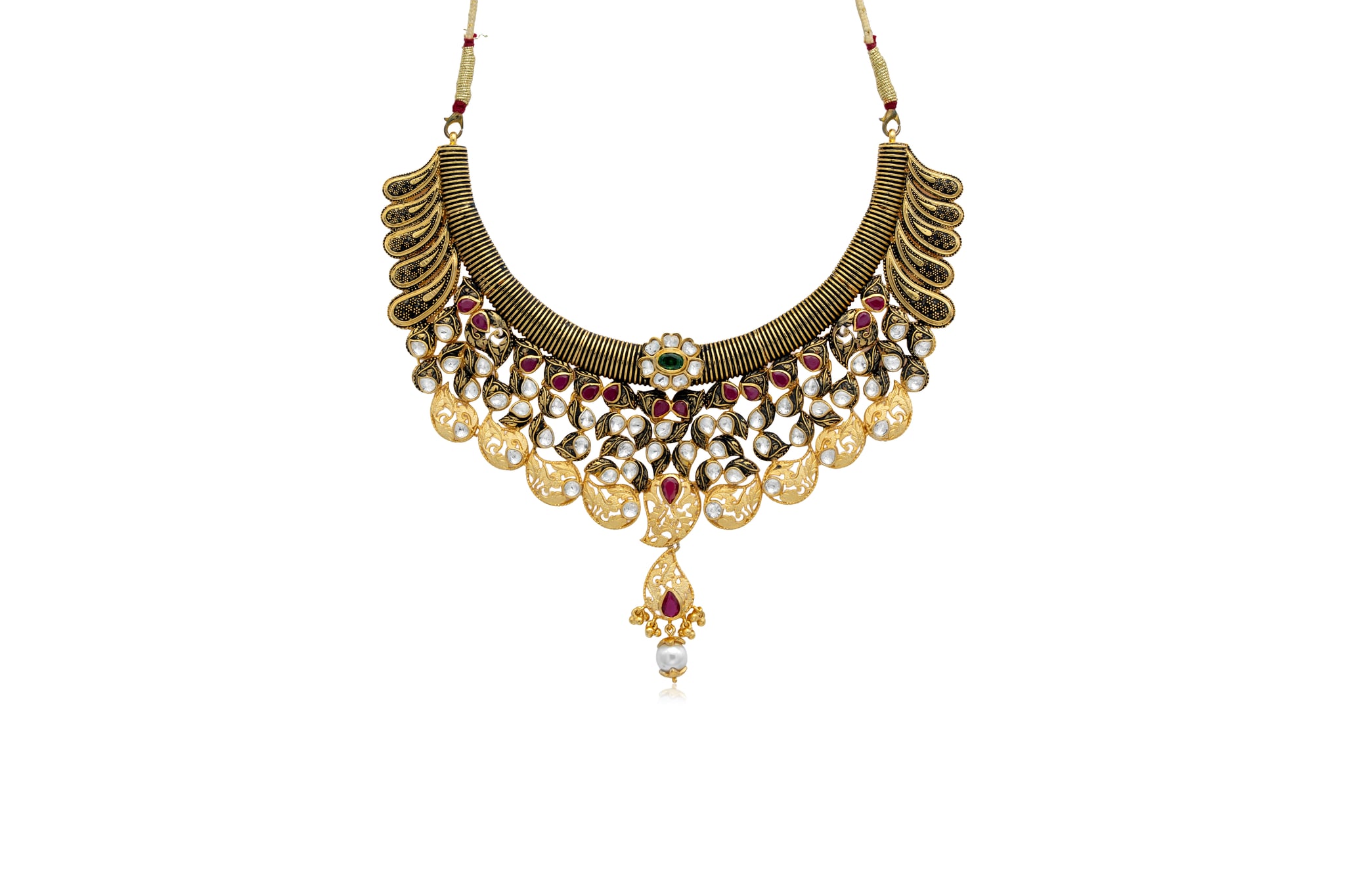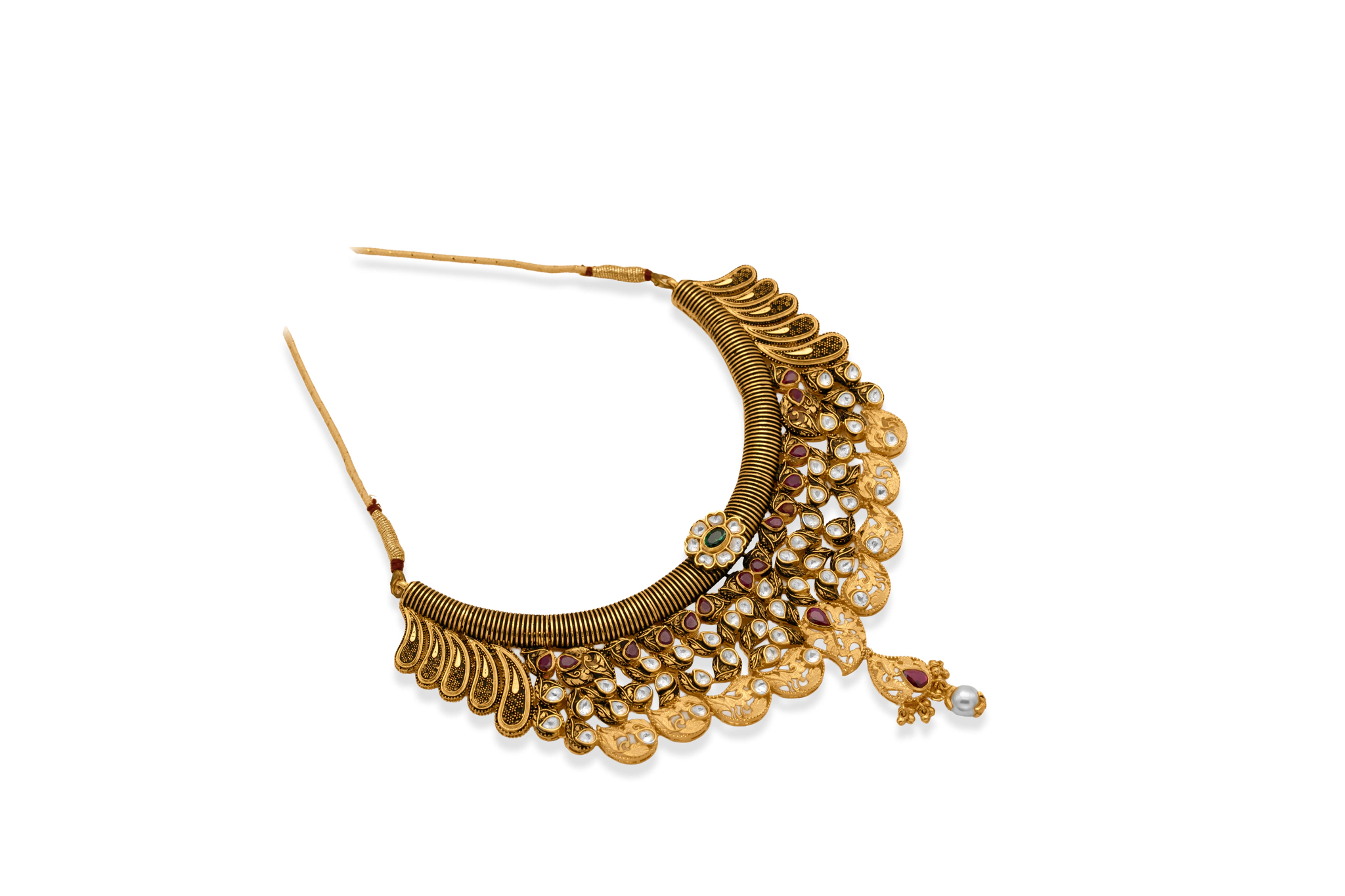 Sparkle with timeless elegance in this breathtaking 22k Gold Kundan Choker Set. Expertly handcrafted for the modern woman who cherishes tradition, this masterpiece features intricate floral motifs and royal peacock-inspired detailing, all meticulously inlaid with shimmering Kundan stones. The rich gold finish is beautifully complemented by deep ruby-red accents and delicate pearl drops, creating a look of pure opulence. Whether it’s your big day or a grand celebration, this necklace and matching drop earrings are designed to make you feel like royalty.