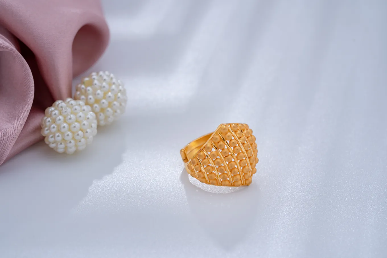 The 22k gold ring featuring a series of small, patterned domes that creates a three-dimensional effect. This ring showcases luxurious yet traditional appeal. This is statement piece will surely hype up your style.