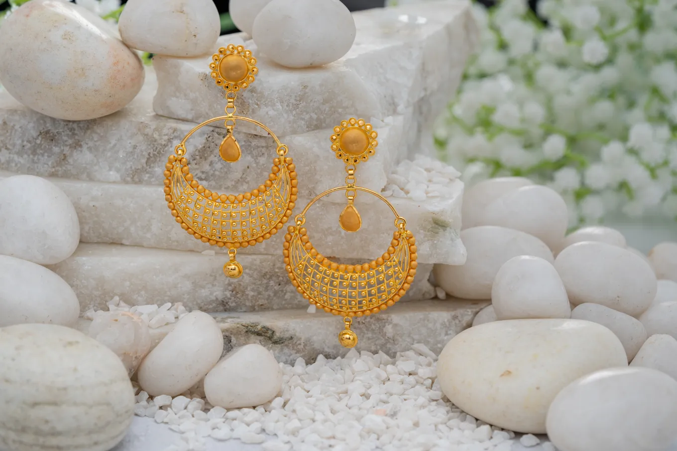 Embrace traditional elegance with these Rawa Chandbali Earrings.These exquisite 22k gold earrings showcase a regal and intricate design, perfect for making a bold statement. The top features a round floral stud with delicate bead detailing, leading to an elegant hoop-shaped structure adorned with a lattice-like gold mesh. A teardrop-shaped gold charm dangles in the center, enhancing the earrings' movement and grace. The final touch is a small golden sphere at the bottom, completing the luxurious and traditional aesthetic. These earrings are a stunning blend of heritage and contemporary design, making them ideal for weddings, festive occasions, or special celebrations. Perfect for festive occasions and celebrations, these earrings add a touch of regal charm to any ensemble.