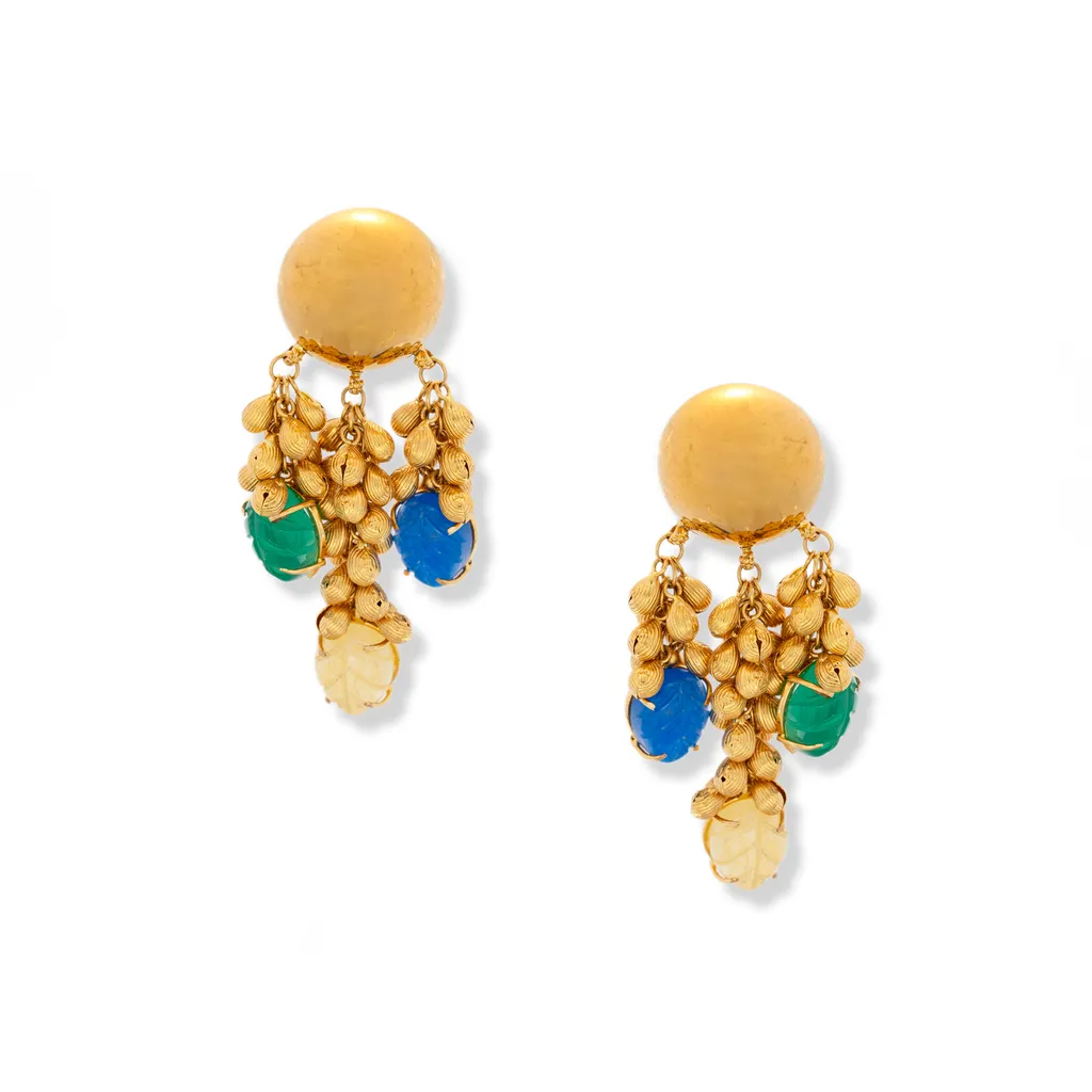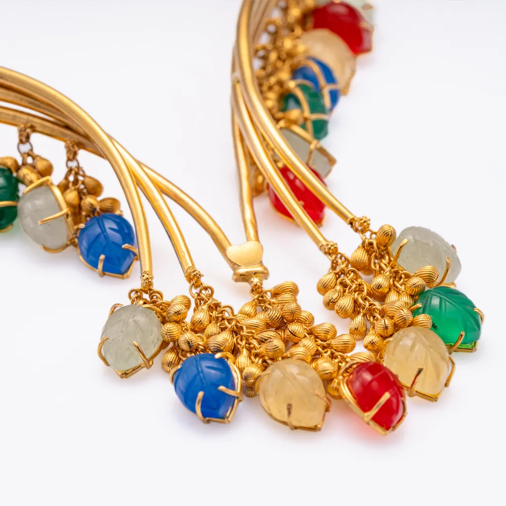 This breathtaking 22k gold necklace is a celebration of traditional artistry and vibrant elegance. Designed in a gracefully, it is adorned with clusters of intricately crafted gold beads and multicolored gemstones in shades of blue, green, red, and white. The rich contrast of hues adds a dynamic and regal charm, while the cascading design creates a sense of movement and opulence. The combination of fine gold craftsmanship and vivid gemstones makes this necklace a statement piece, perfect for festive occasions, cultural celebrations, or grand events.