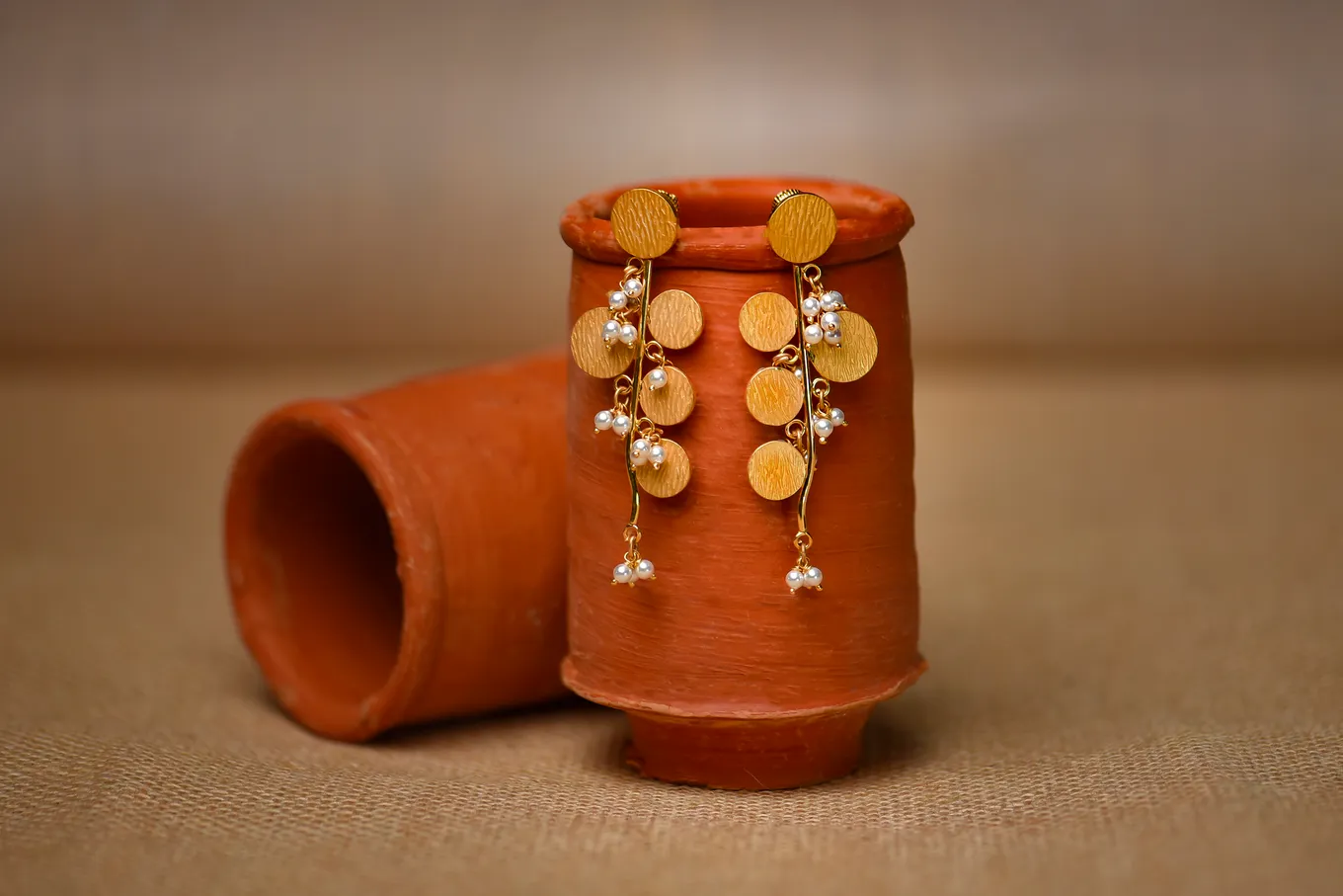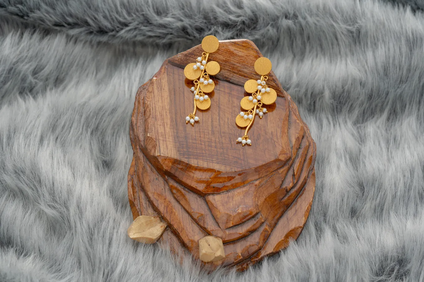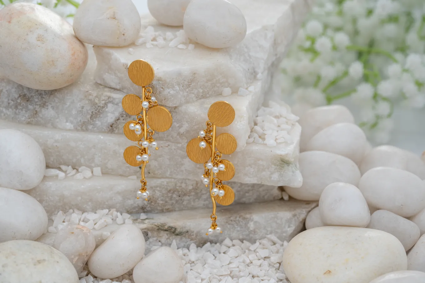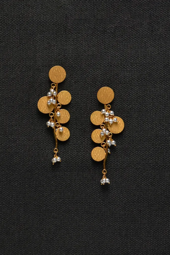 This is a pair of 22k gold earrings with a modern, abstract design, showcasing a blend of geometric shapes and delicate embellishments. The earrings feature a circular stud at the top, followed by a series of overlapping circular discs of varying sizes, creating a cascading effect. These discs, crafted from the warm, rich-toned 22k gold, indicative of its purity, are connected by delicate gold chains. Interspersed along the chains are small, white beads adding a touch of contrast and sparkle. The overall design suggests a contemporary and chic aesthetic, making it a versatile piece that could be worn for both casual and formal occasions, adding a touch of modern elegance to any ensemble. So embrace glamour with these stunning gold earrings which will make you feel stunning.