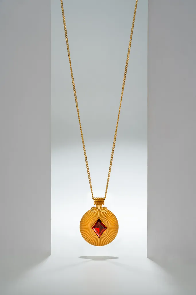 This exquisite 22k gold pendant is a masterpiece of timeless elegance and craftsmanship. Featuring a perfectly round, sunburst-textured gold disc, the pendant radiates sophistication and warmth. At its center, a striking diamond-shaped red gemstone adds a bold touch of color, drawing the eye with its deep, fiery brilliance. The finely detailed gold work, enhances the pendant’s vintage charm, making it a regal yet versatile piece.This pendant is perfect for those who appreciate refined luxury and statement jewelry.