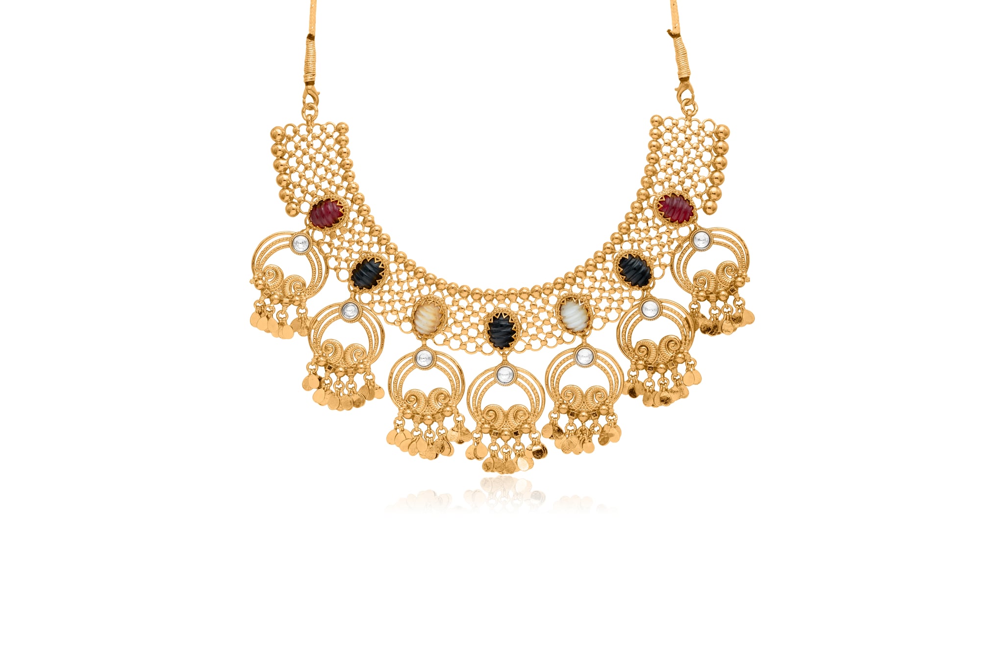 Radiate timeless elegance with this exquisite 22k gold necklace set, a true masterpiece of artisanal craftsmanship. This stunning ensemble features a broad, intricately woven gold mesh collar that rests gracefully against the neckline, accented by a rhythmic arrangement of richly toned quartz stones. Each deep-hued gemstone is framed by delicate circular motifs and suspended golden droplets that catch the light with every movement. Complete with a pair of matching statement earrings, this set blends traditional antique-inspired aesthetics with a bold, contemporary silhouette. Whether you are dressing for a grand wedding or a festive celebration, this quartz and gold set is designed to be a cherished heirloom that commands attention.