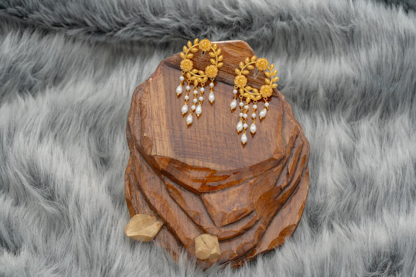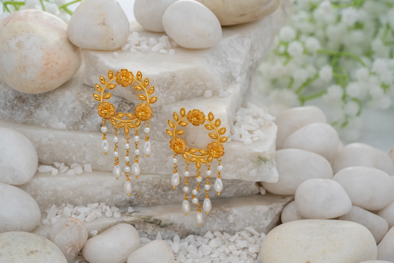 This is a pair of 22K gold wreath crafted with precision with a delicate, nature-inspired design. The earrings feature a circular hoop, crafted from the warm, rich-toned 22k gold, indicative of its purity. The hoop is adorned with intricately detailed leaves and floral motifs, creating a wreath-like effect. Dangling from the bottom of the hoop are multiple delicate chains with beads. The earrings exude a sense of femininity and grace, suggesting a piece that could be worn for festive occasions, reflecting the timeless appeal of gold jewellery with a touch of natural inspiration. Wear these earrings and attention will complement belle's beauty and is a perfect choice with your festive wear.