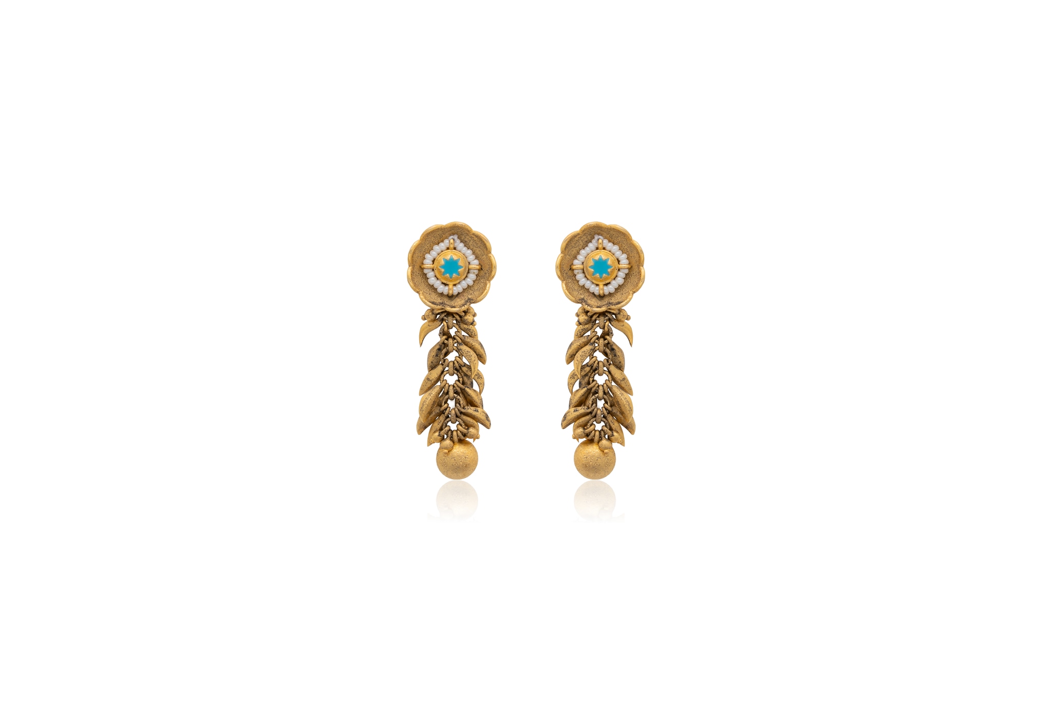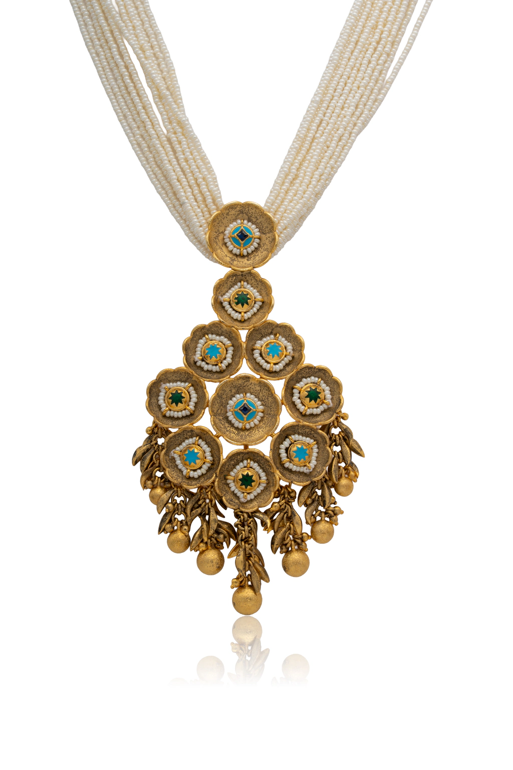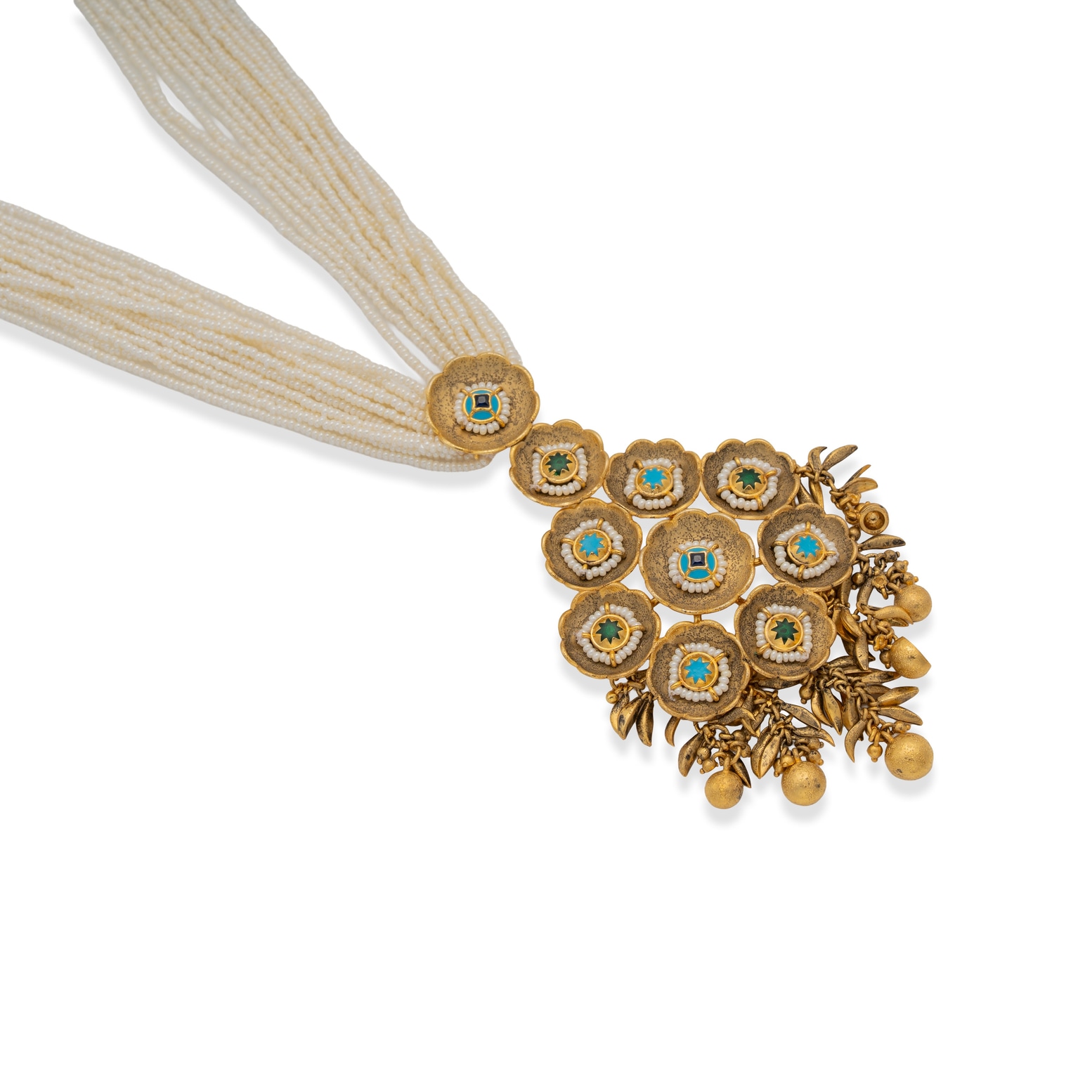 Traditional aesthetics meet modern artistry in this gold-plated silver ensemble, where multi-layered seed pearls support a magnificent tiered pendant. The central motif, adorned with vibrant Meenakari work and shimmering zircons, draws direct inspiration from the iconic peacock feather tucked into Lord Krishna’s crown. Each floral element mirrors the "eye" of the feather, finished with golden droplets that add a rhythmic sway to the piece. Matching drop earrings echo this divine geometry, utilizing a textured leaf-like pattern to create a cohesive look rooted in cultural heritage and timeless devotion.